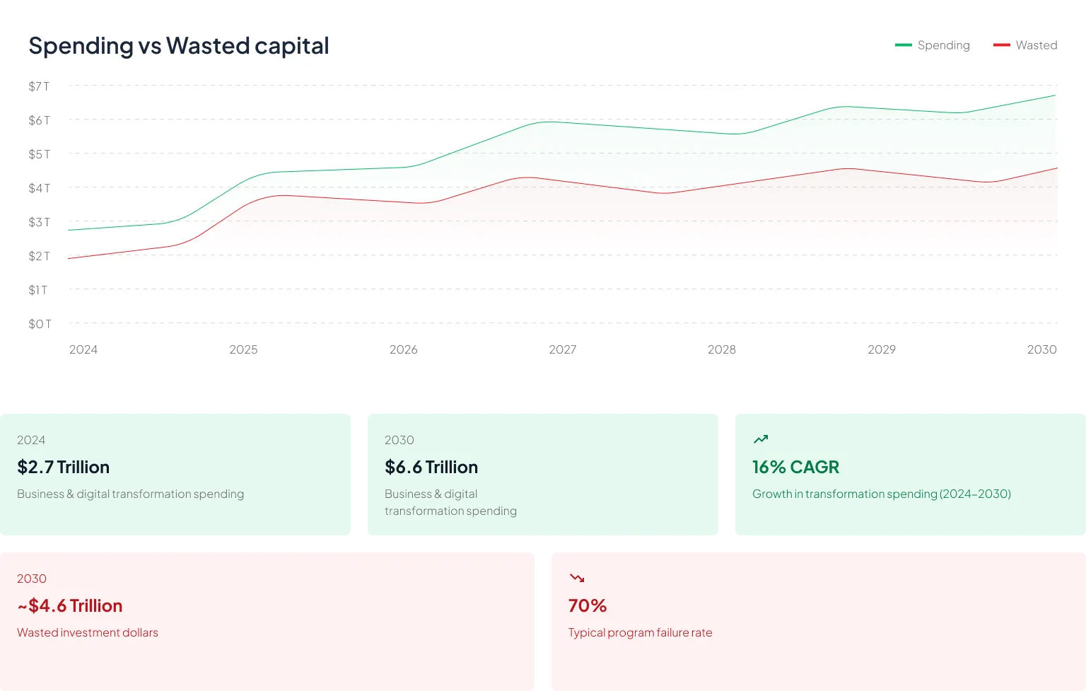 AI is accelerating the volume of transformation and innovation initiatives at an unprecedented pace. But most organisations are not equipped to manage this scale effectively. As investment surges, so does waste, with $1.9T lost in 2024 and a projected $4.6T in wasted transformation capital by 2030.